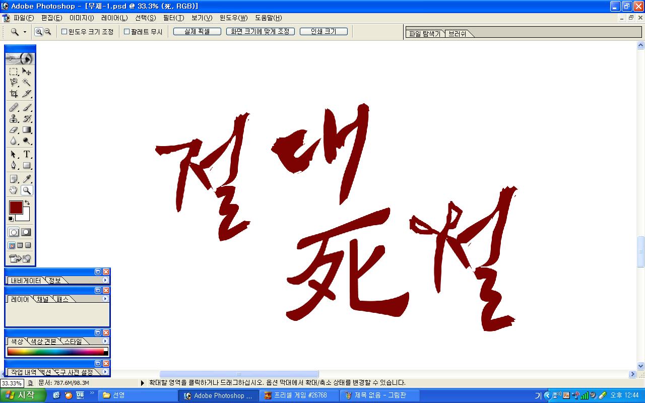정중히 캘리 부탁드립니다. -_- 류재철 일반 0 6092 2009.11.16 11:18 실력자 분들이 많이 계셔서 이렇게 염치없게 부탁드립니다. - 절대死절 : 첨부한 파일 참고해주시면 감사하겠습니다.(약간 거친느낌? ^^;;) : '절'자의 ㅈ은 가위로...^^;; : 포스터 제작용이라 ai 파일이 필요합니다. 대학동아리 연극공연 포스터로 쓸 예정입니다. 비상업적인 공연이라 이렇게 부탁드립니다.