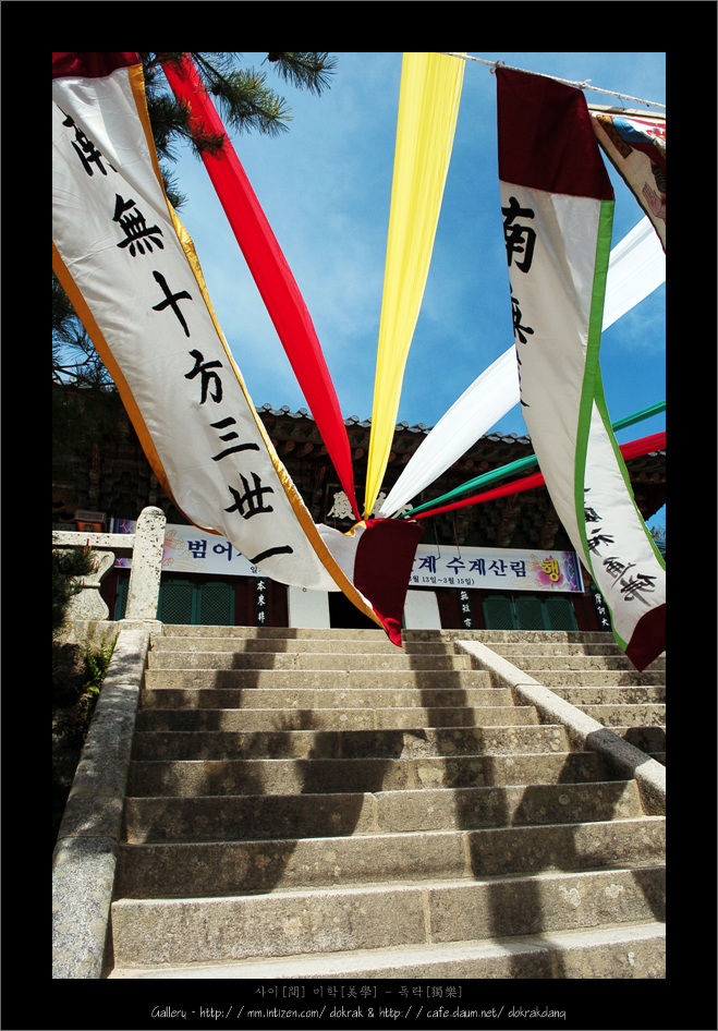 이 절의 오랜 역사를 이야기 해 주는 마당 한귀퉁의 당간에 높다란 장대가 서고, 오색 찬연한 색색의 번이 파란 하늘에 휘날리면 삼삼오오 이 마을, 저 마을에서 사람들이 구름처럼 모여듭니다.